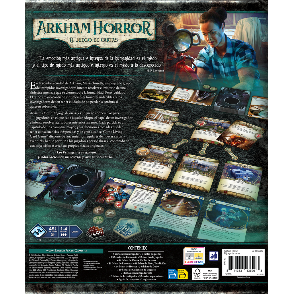 Arkham Horror: El juego de cartas es un juego cooperativo para 1–4 jugadores en el que cada jugador adopta el papel de un investigador e intenta resolver aterradores misterios arcanos. Cada partida es un capítulo de una campaña mayor, y las decisiones tomadas pueden tener consecuencias inesperadas y de gran alcance. Como Living Card Game®, dispone de lanzamientos regulares de nuevas cartas y aventuras, lo que permite a los jugadores personalizar el contenido de esta caja básica o crear sus propios mazos originales.