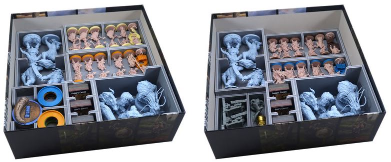 El inserto incluye bandejas para almacenar y organizar todos los componentes del juego como se muestra aquí. Cada jugador recibe su propia bandeja de jugador que tiene ranuras en sus bases para mantener los minis en su lugar. La bandeja para cartas tiene un tamaño que permite colocar todas las cartas enfundadas.