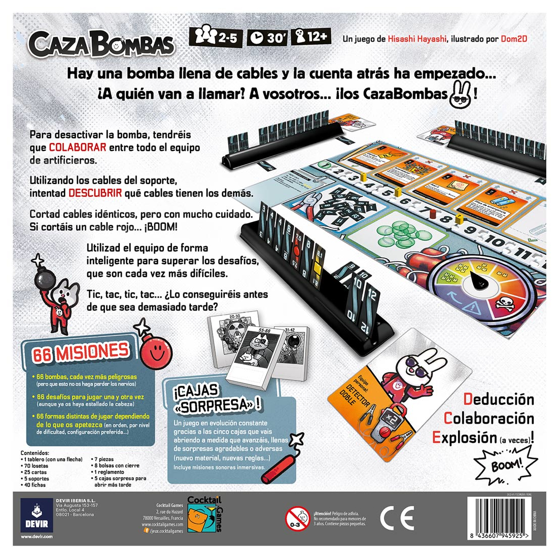 Diseñado por Hisashi Hayashi, Caza Bombas se puede disfrutar en pareja o en grupos de hasta 5 personas, a partir de 12 años, en misiones de unos 30 minutos. Caza Bombas es un juego cooperativo en el que cada jugador lleva a un artificiero. Todos los jugadores deberán trabajar en equipo con el objetivo de desactivar juntos la bomba de la misión asignada. ¡Pero cuidado! Si cortáis un cable rojo o si el detonador llega al final, ¡la bomba explotará!