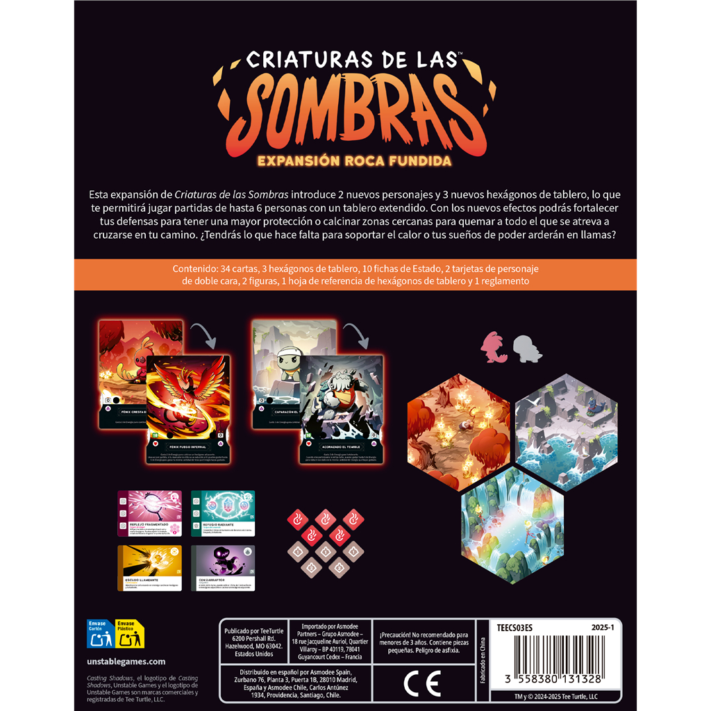 Esta expansión de Criaturas de las Sombras introduce 2 nuevos personajes y 3 nuevos hexágonos de tablero, lo que te permitirá jugar partidas de hasta 6 personas con un tablero extendido. Con los nuevos efectos podrás fortalece tus defensas para tener una mayor protección o calcinar zonas cercanas para quemar a todo el que se atreva a cruzarse en tu camino.