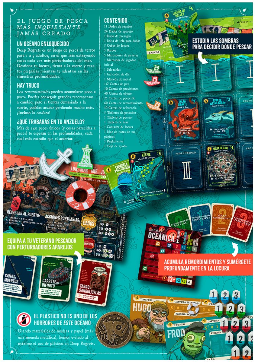 Observa el tamaño de las sombras en el reverso de 9 bancos de peces diferentes a tres profundidades, determinando cuánto crees que puedes permitirte pescar y si quieres arriesgarte para obtener una recompensa potencialmente mejor. Voltea los peces, gasta dados, añádelos a tu colección, ¡pero ten cuidado con las habilidades de revelar y capturar que pueden tener varios efectos en el juego! A medida que tus ojos descubren cosas cada vez más aterradoras, coleccionarás cartas de Arrepentimiento, que aumentan tu locura, pero también te dan acceso a más dados y aumentan el valor de los peces más raros. Es un escenario de riesgo/recompensa mientras equilibras tu locura, sabiendo que al final de la partida, el jugador con el mayor valor de Arrepentimientos tendrá que descartar su pez expuesto más valioso. Administra tus recursos, toma decisiones estratégicas, aprovecha la locura y suprime tus Arrepentimientos mientras intentas capturar la presa más valiosa de peces cada vez más raros en esta peculiar semana en el mar.