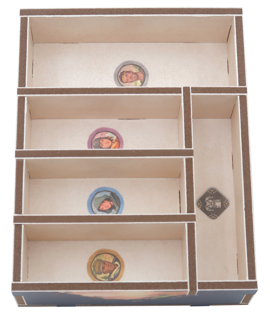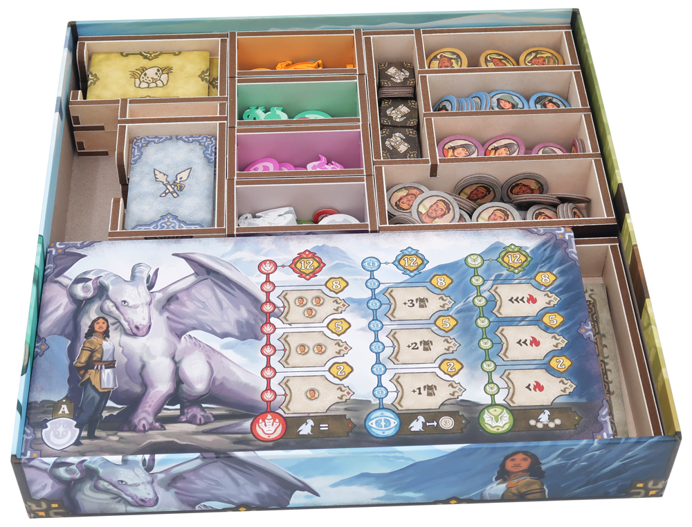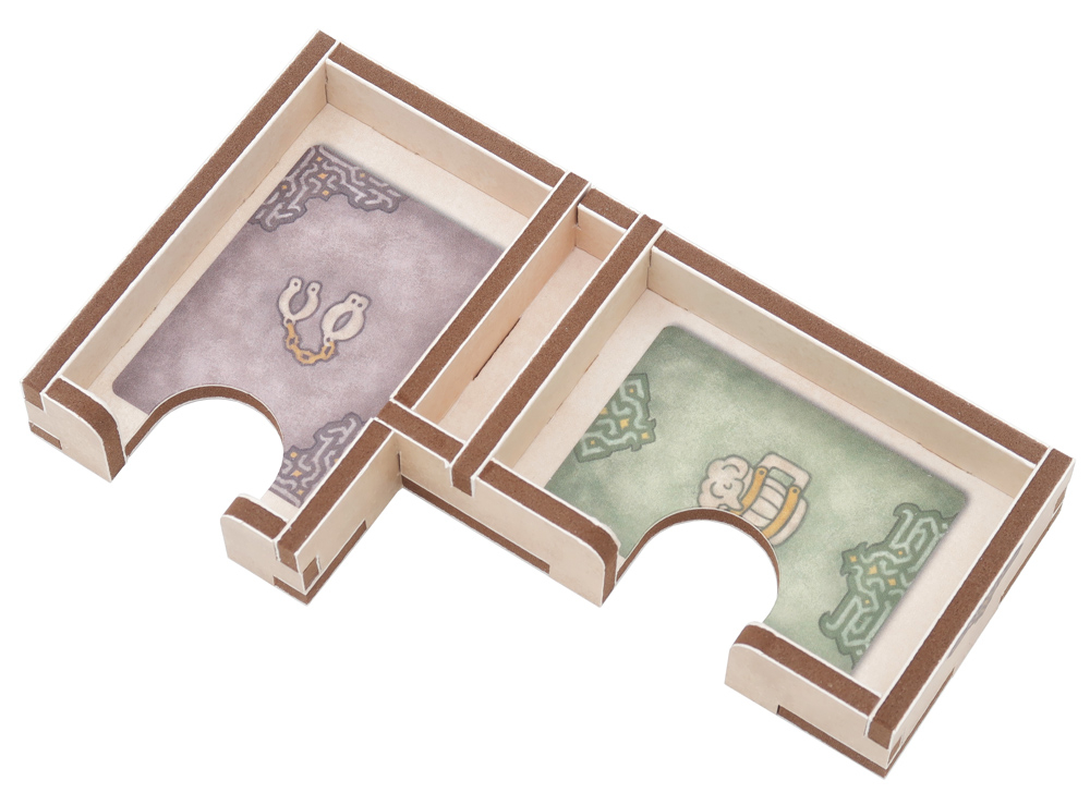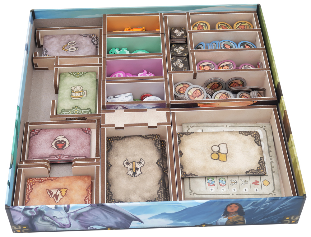 El inserto está organizado en hasta dos capas, y cada jugador tiene su propia bandeja dedicada. Todas las bandejas se pueden sacar de la caja y se pueden usar durante el juego para mantener la mesa ordenada. Hay espacio para todas las cartas con fundas.