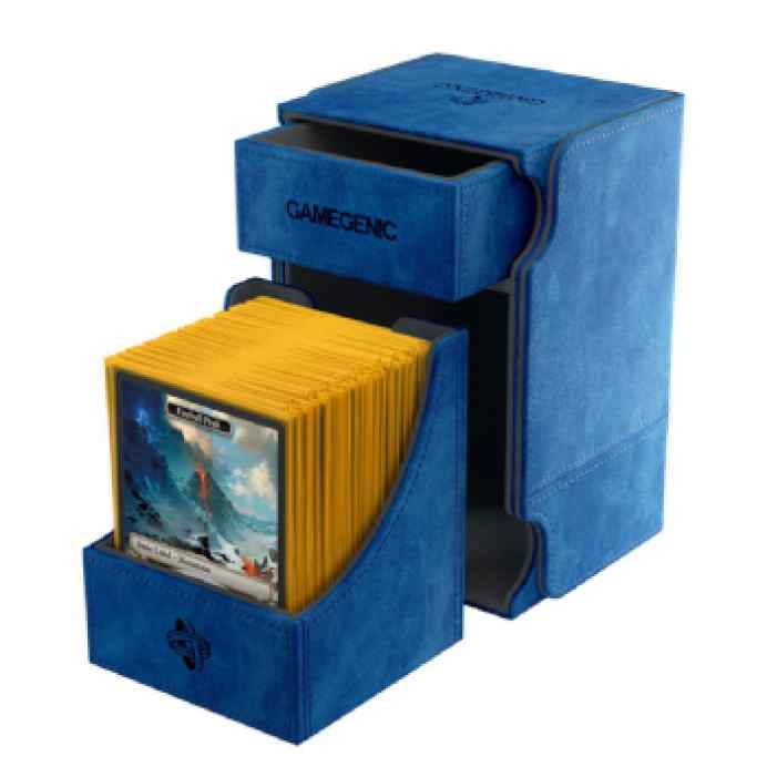 El modelo convertible Watchtower 100+ combina caja para mazos, cajón para accesorios y bandeja para cartas en un elegante producto.