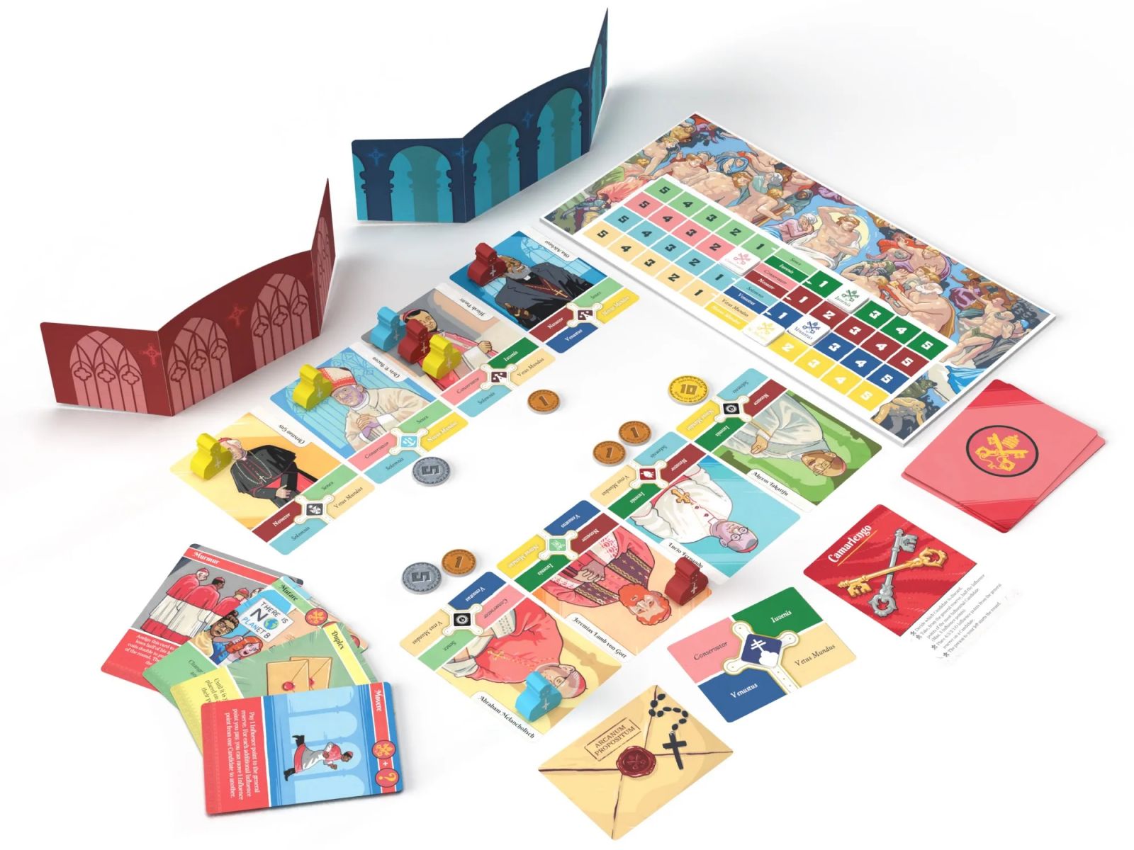 Los cardenales deberán manejar cuidadosamente su influencia en la curia romana, guardando celosamente secretos que podrían elevar o destruir candidaturas, mientras mantienen una imagen de piedad ante sus pares y los fieles. Cada jugador o jugadora deberá tejer su propia red de aliados, sabiendo que la lealtad puede ser tan efímera como el humo que señala el resultado de cada votación. Los cardenales más astutos sabrán cuándo revelar sus cartas y cuándo mantener sus verdaderas intenciones ocultas bajo el peso de sus capelos rojos. El arte delengaño se entrelaza con la necesidad de construir coaliciones creíbles, creando un delicado equilibrio entre la ambición personal y el bien mayor de la Iglesia.