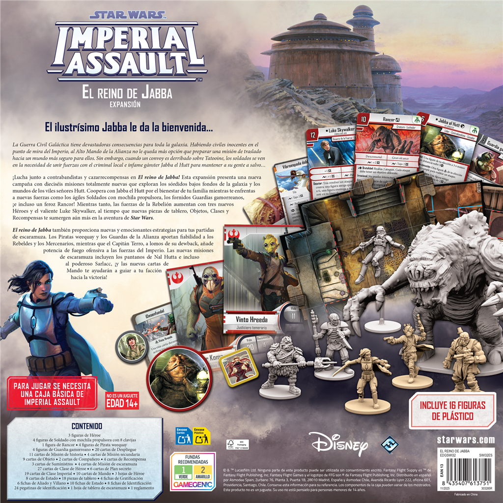 ¡Lucha junto a contrabandistas y cazarrecompensas en El reino de Jabba! Esta expansión presenta una nueva campaña con dieciséis misiones totalmente nuevas que exploran los sórdidos bajos fondos de la galaxia y los mundos de los viles señores Hutt. Coopera con Jabba el Hutt por el bienestar de tu familia mientras te enfrentas a nuevas fuerzas como los ágiles Soldados con mochila propulsora, los fornidos Guardias gamorreanos, ¡e incluso un feroz Rancor! Mientras tanto, las fuerzas de la Rebelión aumentan con tres nuevos Héroes y el valiente Luke Skywalker, al tiempo que nuevas piezas de tablero, Objetos, Clases y Recompensas te sumergen aún más en la aventura de Star Wars.