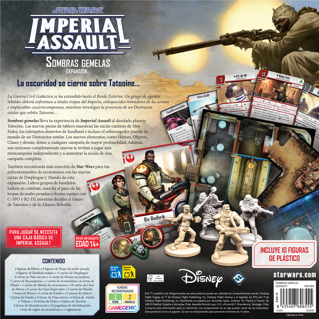 Sombras gemelas lleva tu experiencia de Imperial Assault al desolado planeta Tatooine. Las nuevas piezas de tablero muestran las sucias cantinas de Mos Eisley, los inhóspitos desiertos de Jundland e incluso el sobrecogedor puente de mando de un Destructor estelar. Los nuevos elementos, como Héroes, Objetos, Clases y demás, dotan a cualquier campaña de mayor profundidad. Además, seis misiones completamente nuevas te invitan a jugar una minicampaña independiente y a aumentar la escala de una campaña completa.