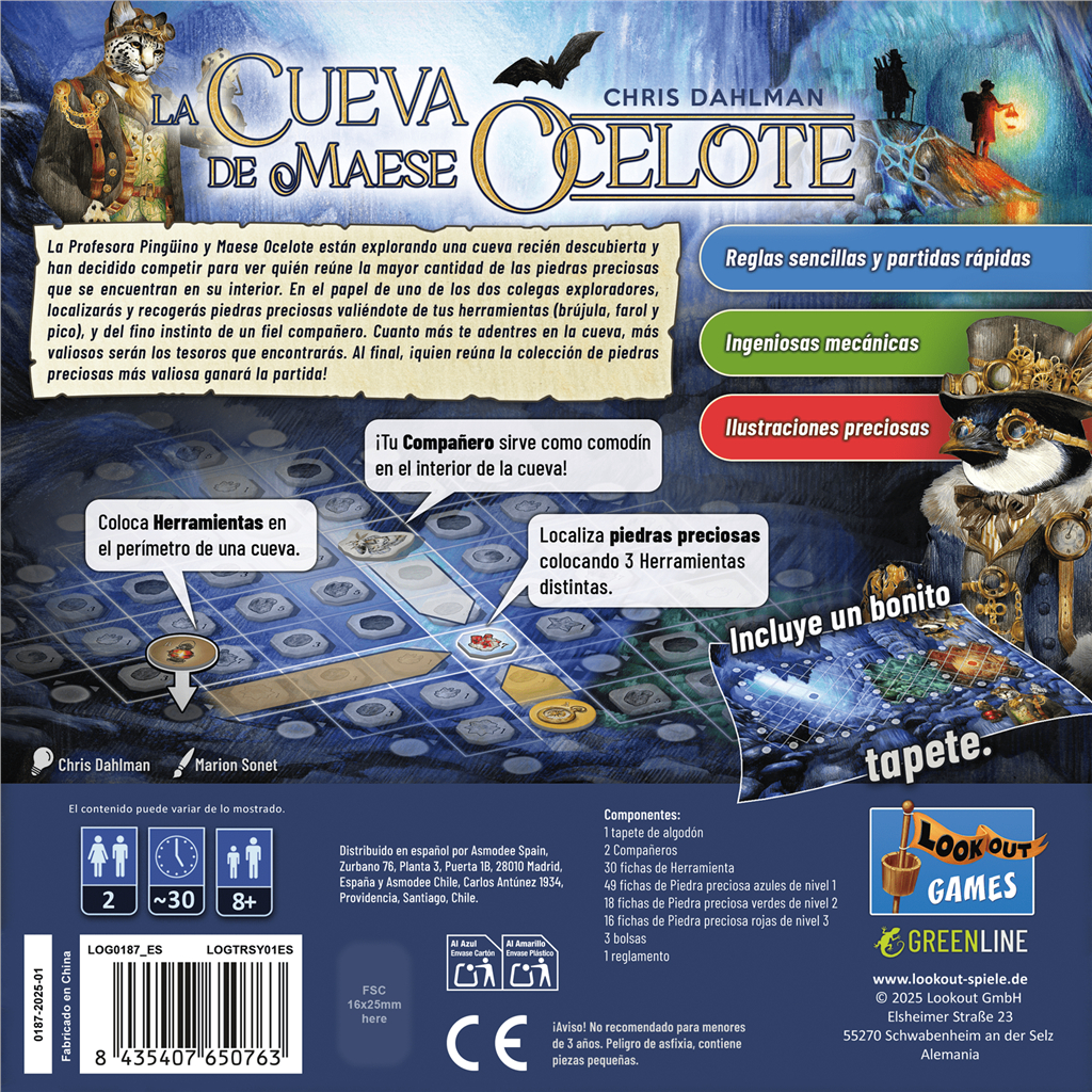 Cuanto más te adentres en la cueva, más valiosos serán los tesoros que encontrarás. Al final, ¡quien reúna la colección de piedras preciosas más valiosa ganará la partida!