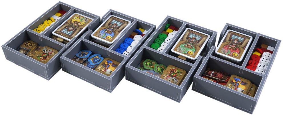 Estas son las dos bandejas de relleno para el inserto, que se utilizan para sujetar las fichas de juego más grandes y también para colocar las otras bandejas y tableros de inserto en la caja. Las ranuras se han dimensionado para adaptarse a las cartas de juego en caso de que se agreguen más en futuras expansiones.