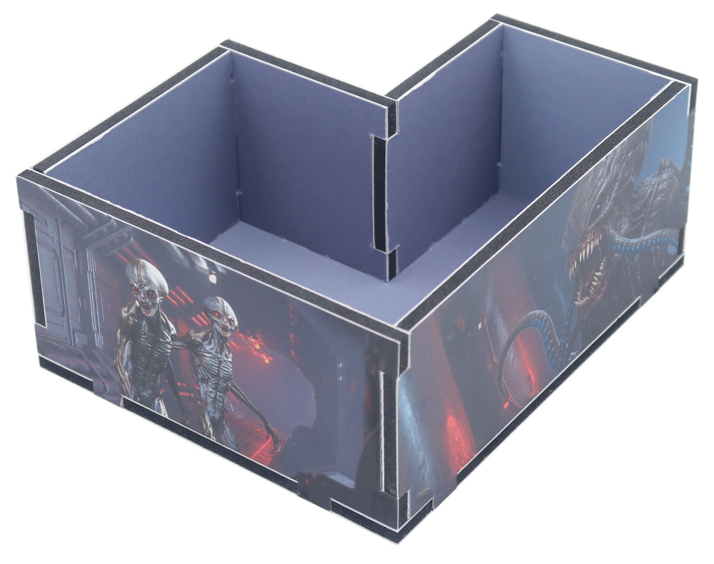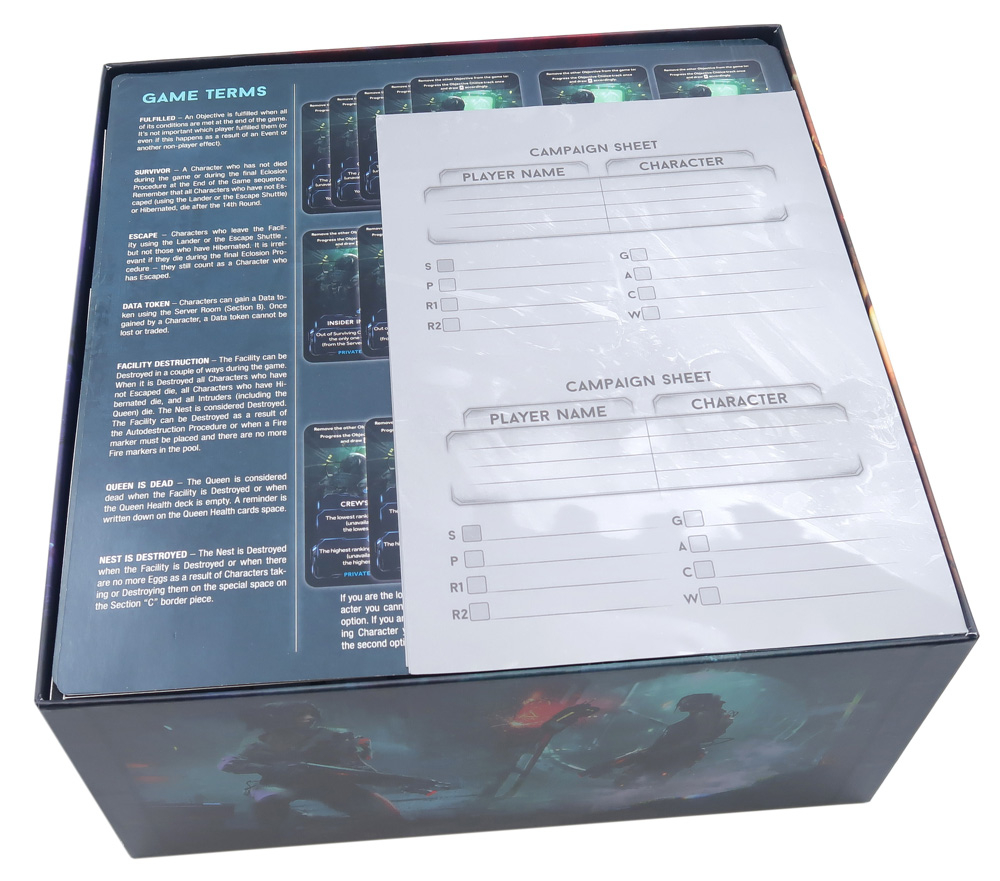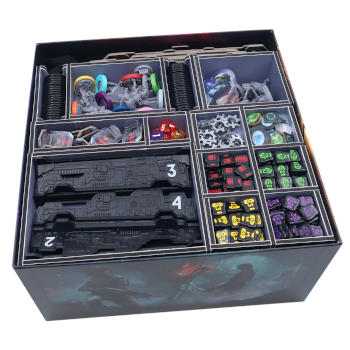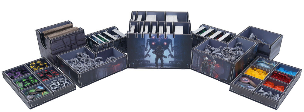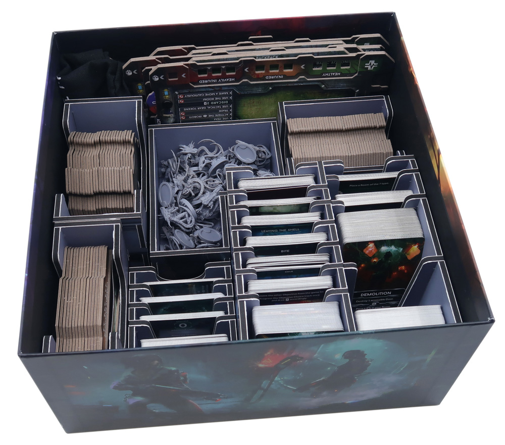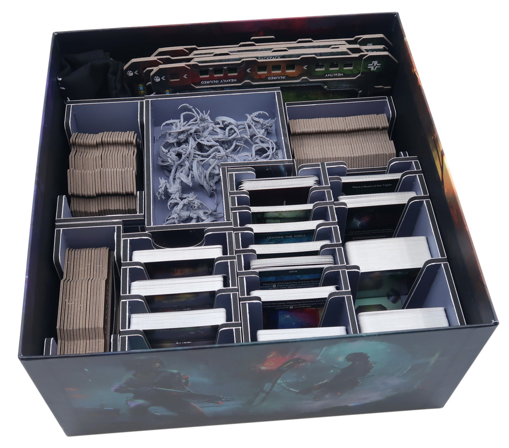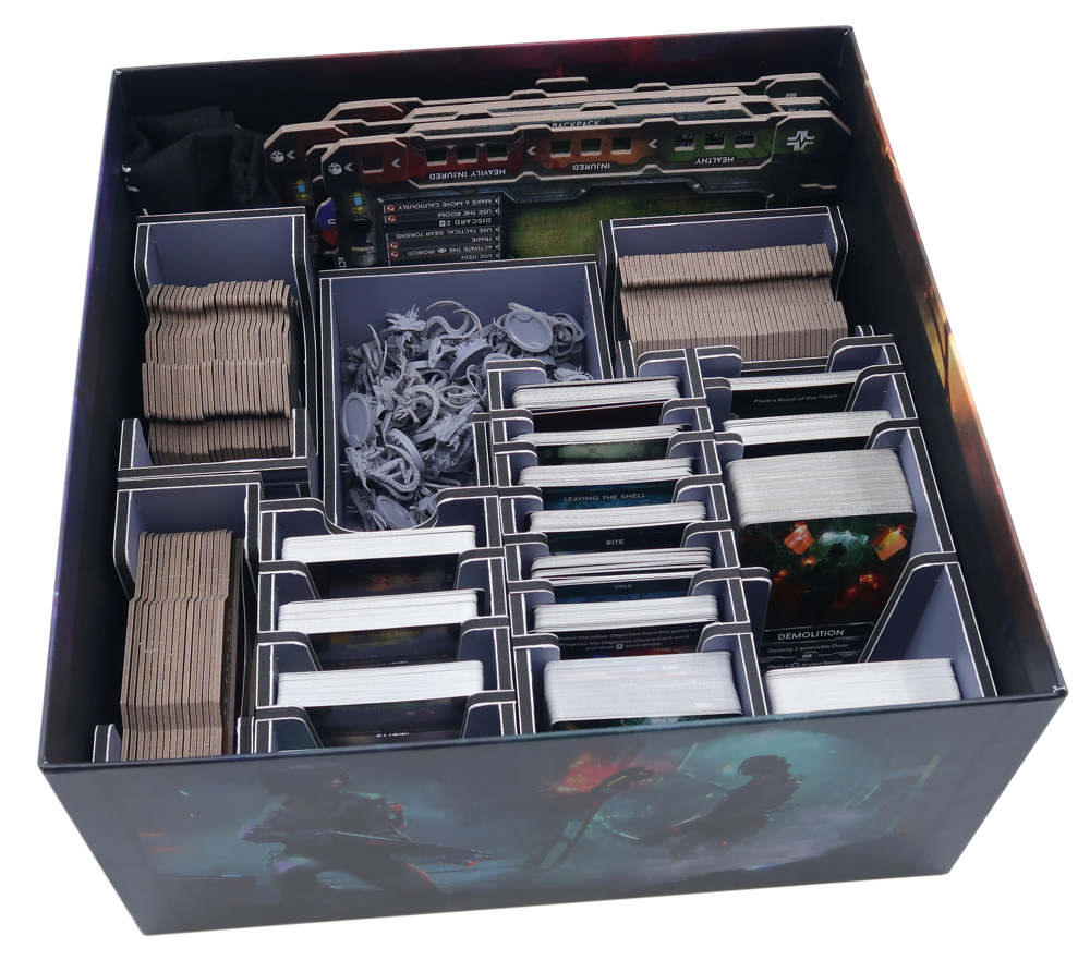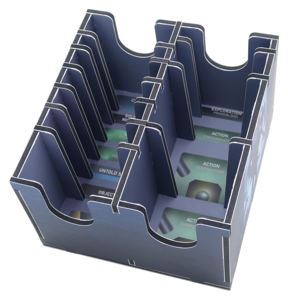El inserto está organizado en hasta cuatro capas, con las tablas de personajes y las piezas de borde más pequeñas colocadas juntas verticalmente en la parte superior de la caja. Hay espacio para todas las cartas con fundas, y todos los mazos de cartas están organizados en sus propias ranuras.