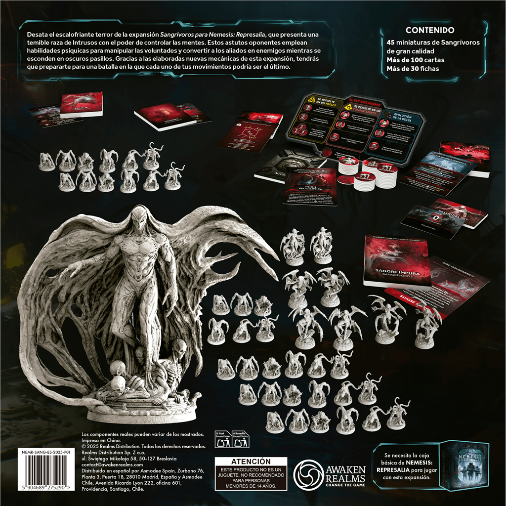 Desata el escalofriante terror de la expansión Sangrívoros para Nemesis: Represalia, que presenta una temible raza de Intrusos con el poder de controlar las mentes. Estos astutos oponentes emplean habilidades psíquicas para manipular las voluntades y convertir a los aliados en enemigos mientras se esconden en oscuros pasillos. Gracias a las elaboradas nuevas mecánicas de esta expansión, tendrás que prepararte para una batalla en la que cada uno de tus movimientos podría ser el último.