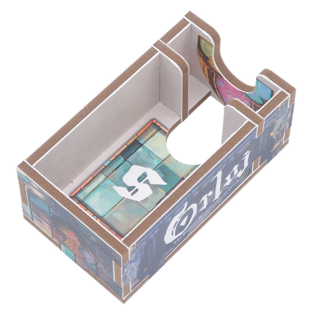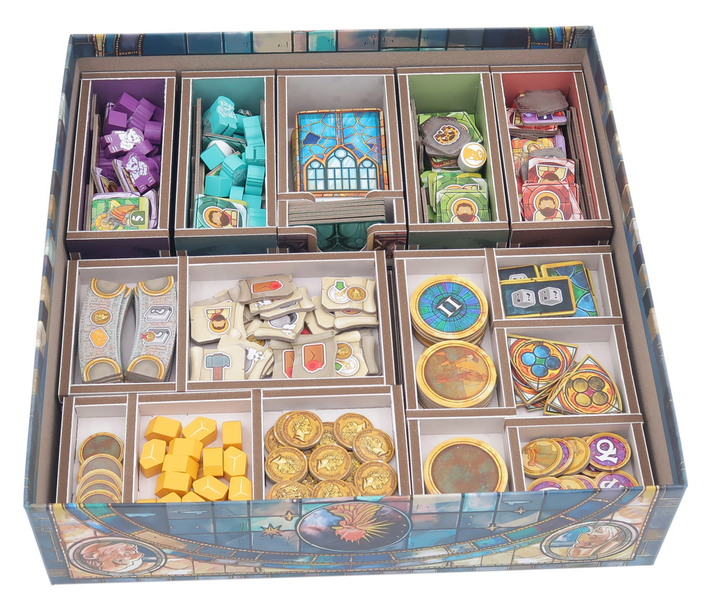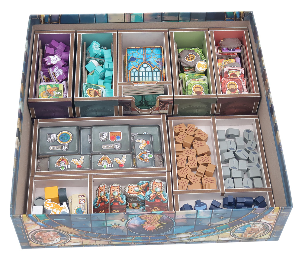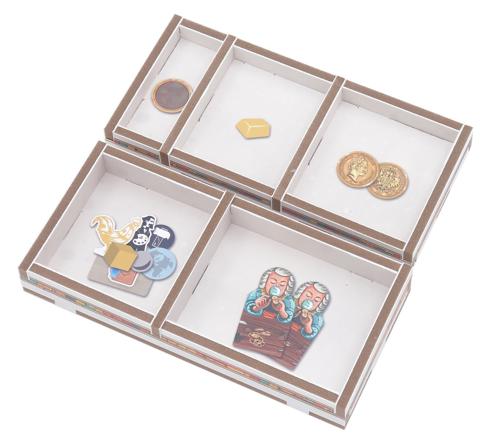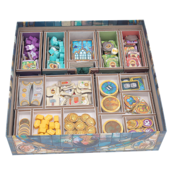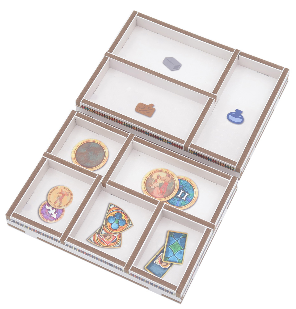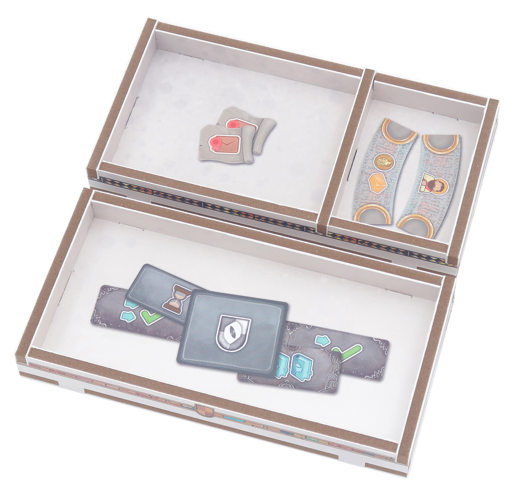 El inserto se distribuye en un máximo de dos capas, y cada jugador dispone de su propia bandeja individual. Todas las bandejas se pueden extraer de la caja y utilizarse durante la partida para mantener la mesa ordenada. Hay espacio suficiente para que todas las cartas vayan protegidas con fundas.