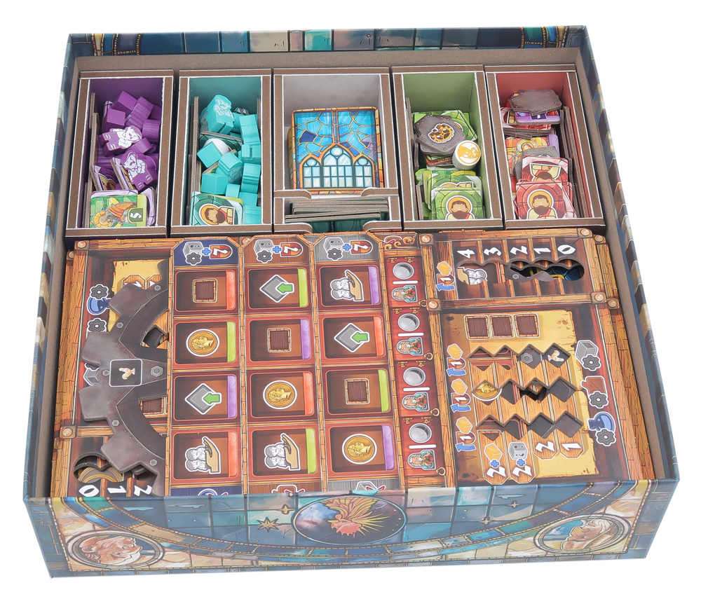El diseño ofrece tanto un almacenamiento eficiente como una mejora en la jugabilidad. Muchas de las bandejas se pueden utilizar durante la partida y facilitan enormemente los tiempos de preparación y recogida. Las reglas y los tableros sirven de tapa para cubrir las bandejas.