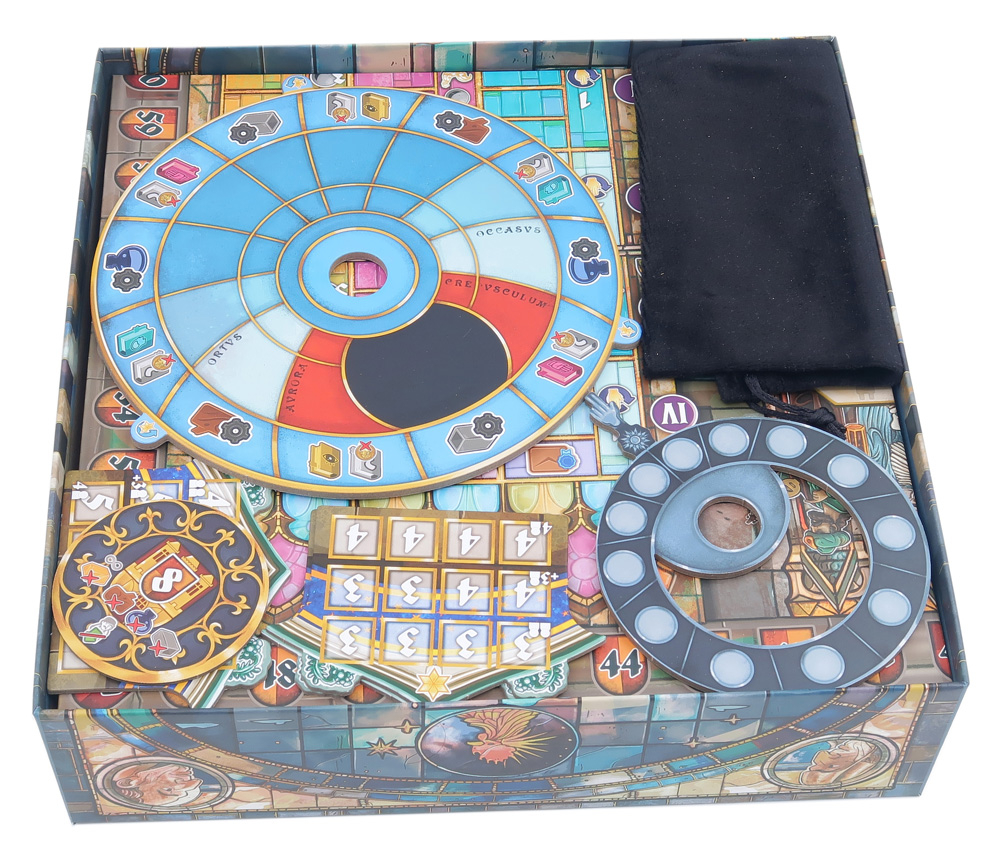 Al empaquetar la caja, coloca primero los cuatro tableros de jugador en los huecos previstos, alternando su orientación tal y como se muestra. A continuación, añade el tablero principal del juego encima de las bandejas. Después, coloca la esfera del reloj, las piezas de coronación, el dial de construcción final grande, el dial astronómico y la bolsa, dispuestos tal y como se muestra. El tablero del «recorrido de los apóstoles» se coloca como se indica, con el centro de los engranajes situado de manera que los ejes de plástico queden encajados en los huecos de la capa inferior. Por último, añade el libro de reglas encima de todo. Esto llena completamente la caja sin que se levante la tapa y permite el almacenamiento vertical del juego.