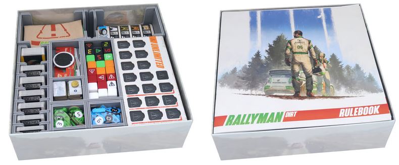 Inserto compatible con Rallyman: DIRT®, incluidas las expansiones 110%®, Climb®, Co-Pilot Pack®, R4®, R5® y Rx®. El diseño proporciona tanto un almacenamiento eficiente como una mejora del juego. Muchas de las bandejas se pueden utilizar durante el juego y facilitan enormemente los tiempos de preparación y retirada. Los libros de reglas actúan como una tapa en la parte superior de las bandejas.
