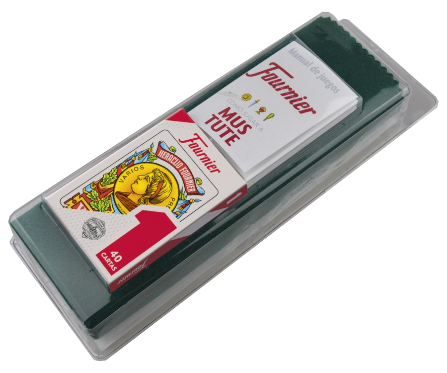 Este set de mus viene con la baraja española Fournier Nº1 de 40C y un set de amarracos, además de instrucciones de Mus y Tute ¡y con tapete!