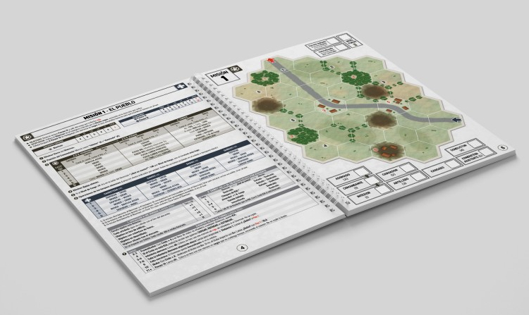 - Cada escenario cuenta con un mapa con rejilla hexagonal y unas instrucciones de despliegue de las unidades del jugador y de la IA y su comportamiento.