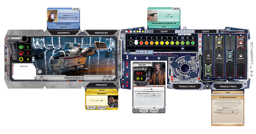 Aunque en Star Wars: El Borde Exterior cada granuja sigue un camino distinto para alcanzar el éxito, todos empiezan desde abajo con una sencilla astronave. Tu panel de jugador no sólo te permite llevar la cuenta de la Fama que has acumulado; también dispone de recuadros especiales donde colocar tus cartas de Nave, Personaje, Equipo, Reputación, Modificaciones, Trabajos y Recompensas.