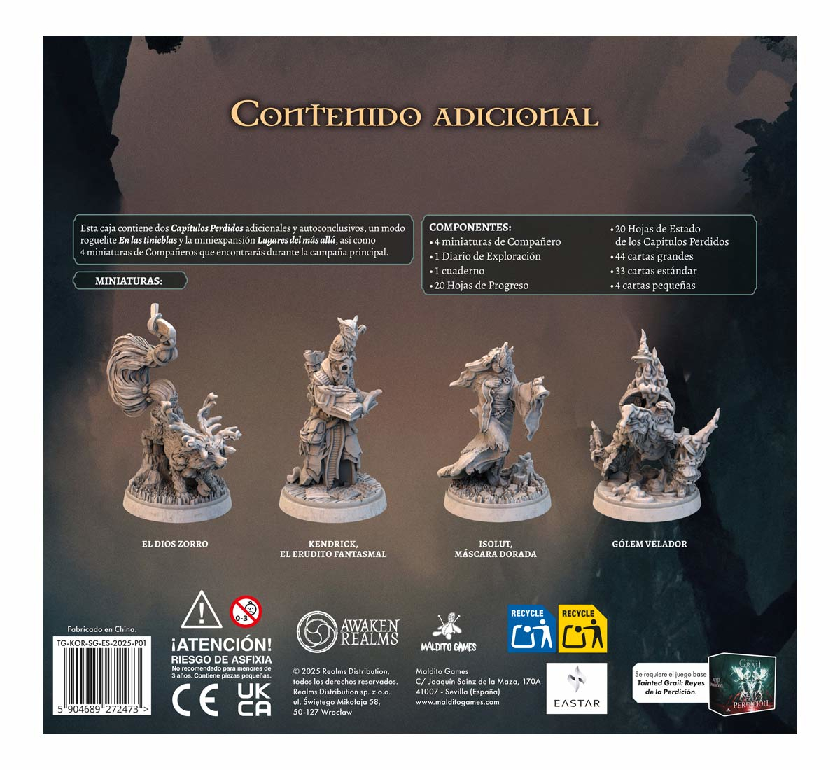 Esta caja contiene dos Capítulos Perdidos adicionales y autoconclusivos, un modo roguelite En las tinieblas y la miniexpansión Lugares del más allá, así como 4 miniaturas de Compañeros que encontrarás durante la campaña principal.
