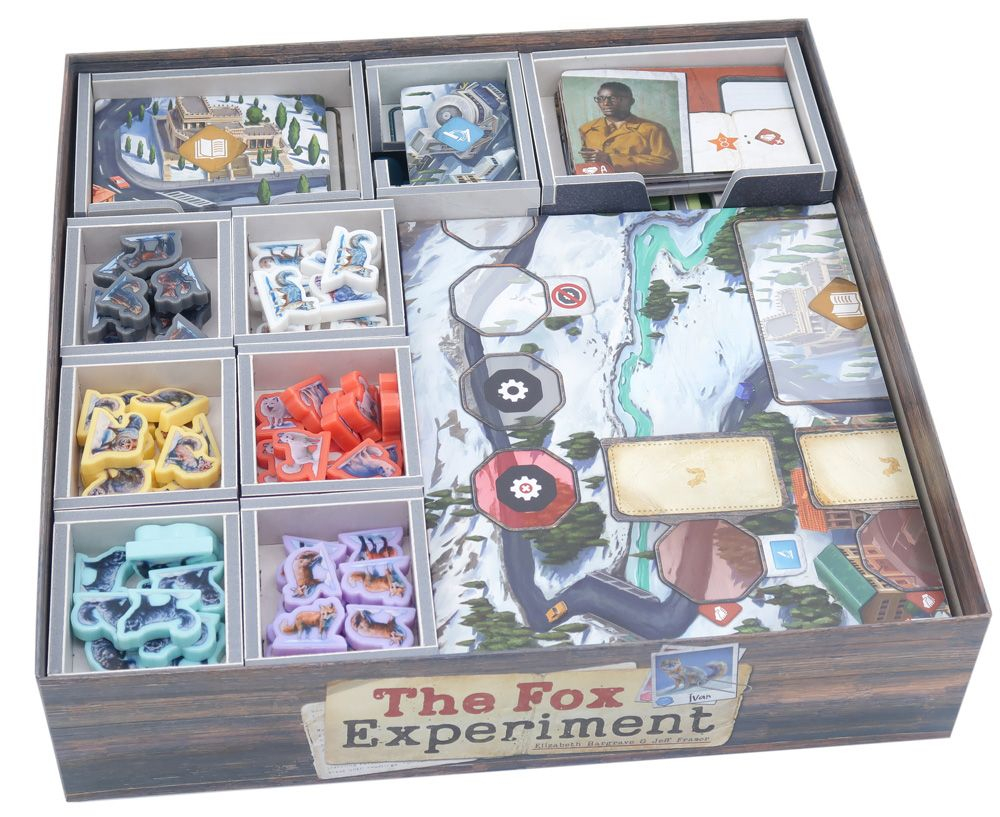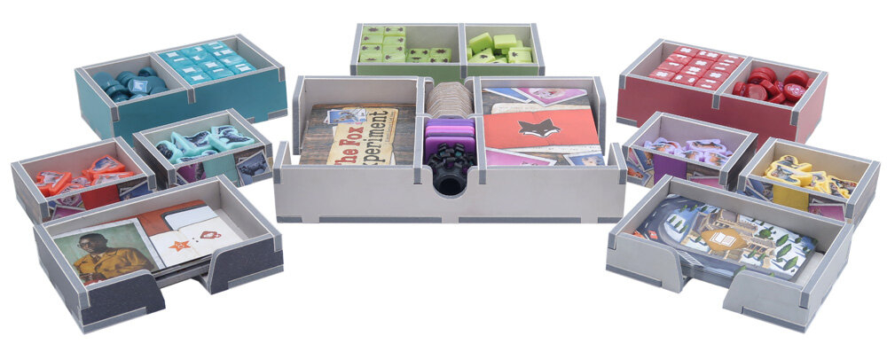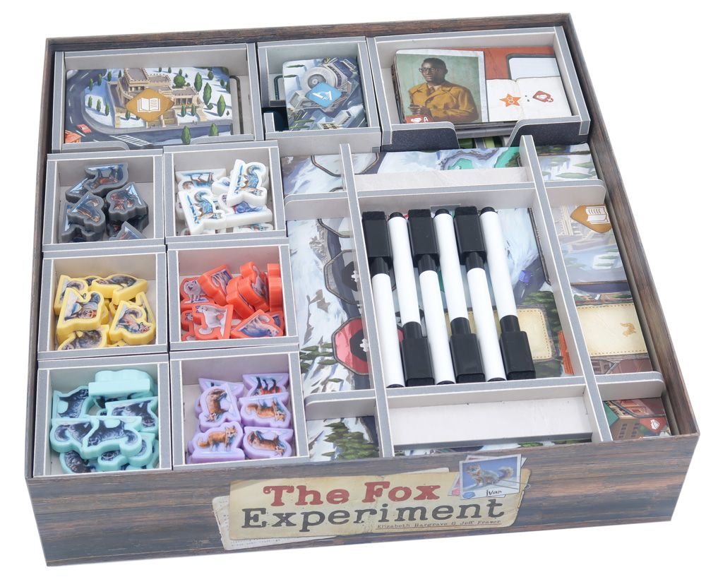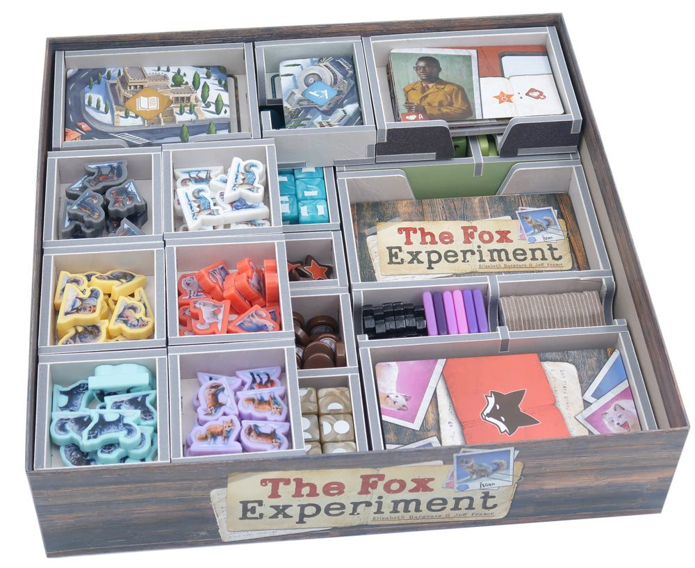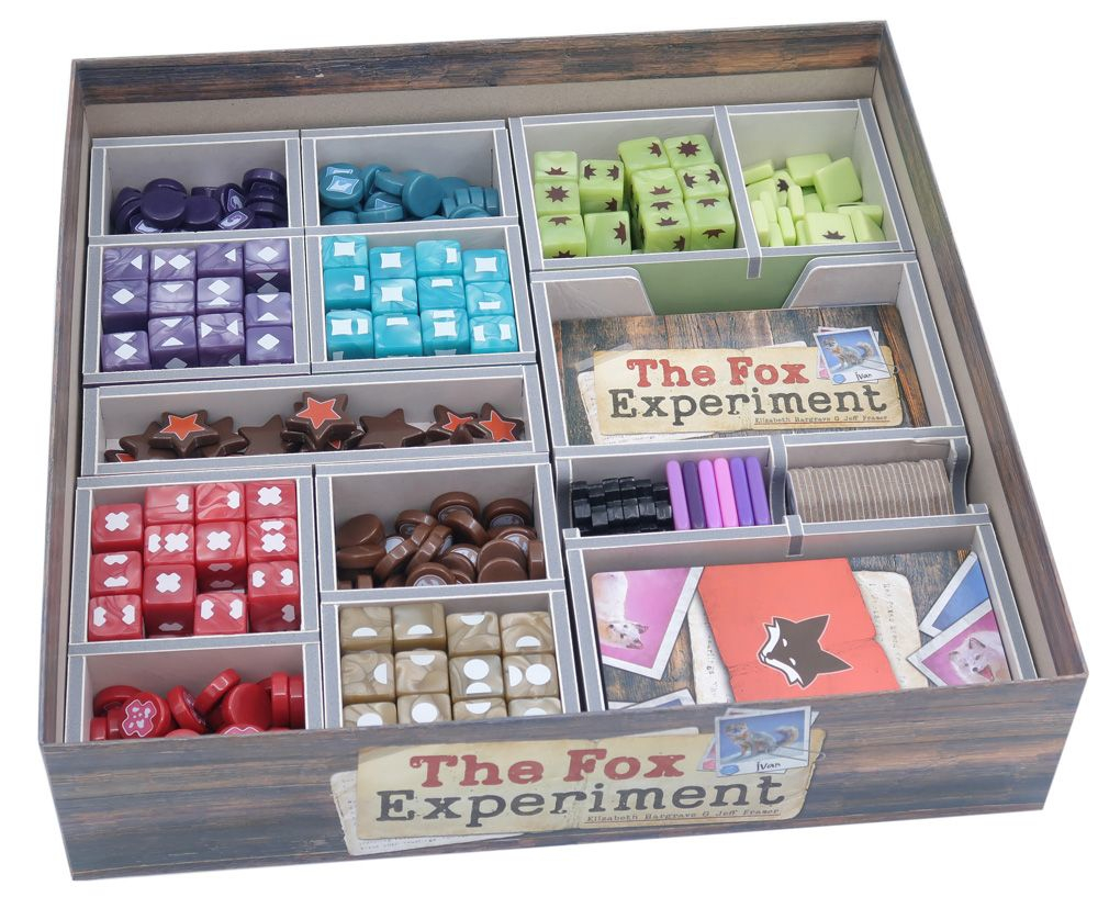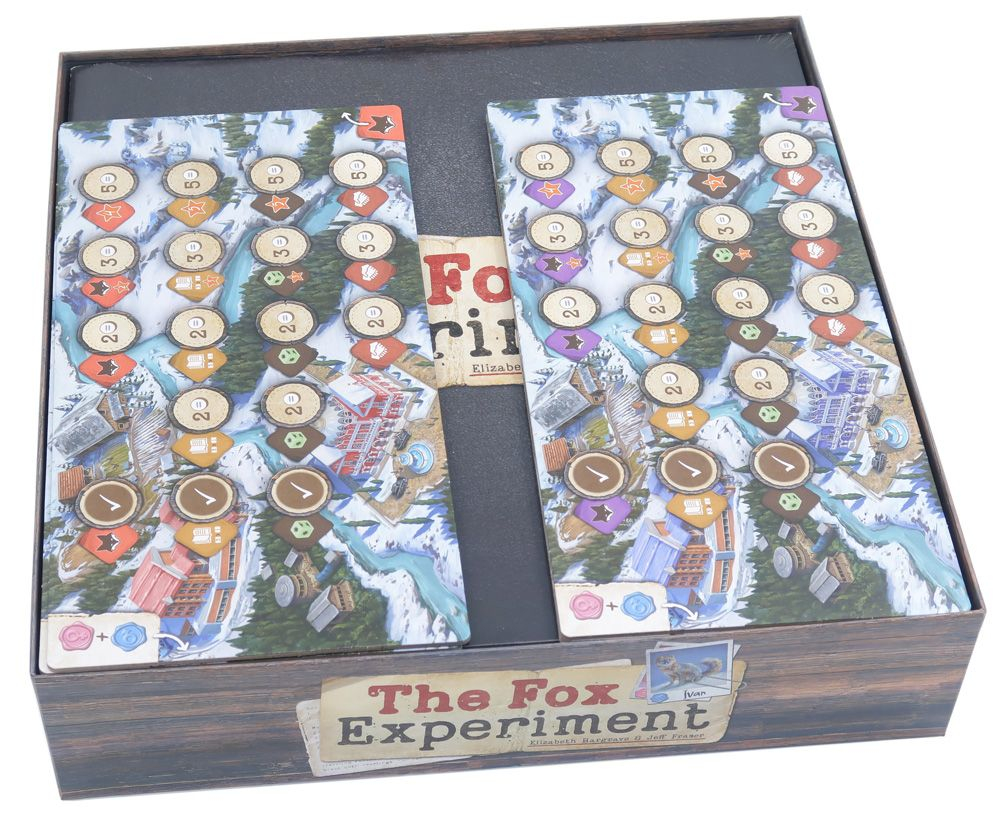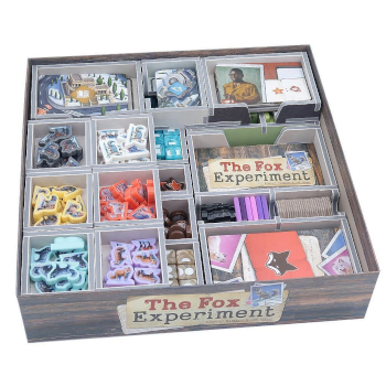 Inserto oficial a todo color compatible con The Fox Experiment®, tanto en la edición comercial como en la de Kickstarter, e incluye espacio para la expansión de 5-6 jugadores.
