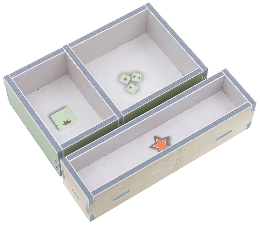 El diseño proporciona un almacenamiento eficiente y mejora la jugabilidad. Muchas de las bandejas se pueden utilizar durante el juego y facilitan enormemente los tiempos de preparación y recogida. Las reglas y los tableros actúan como tapa sobre las bandejas.