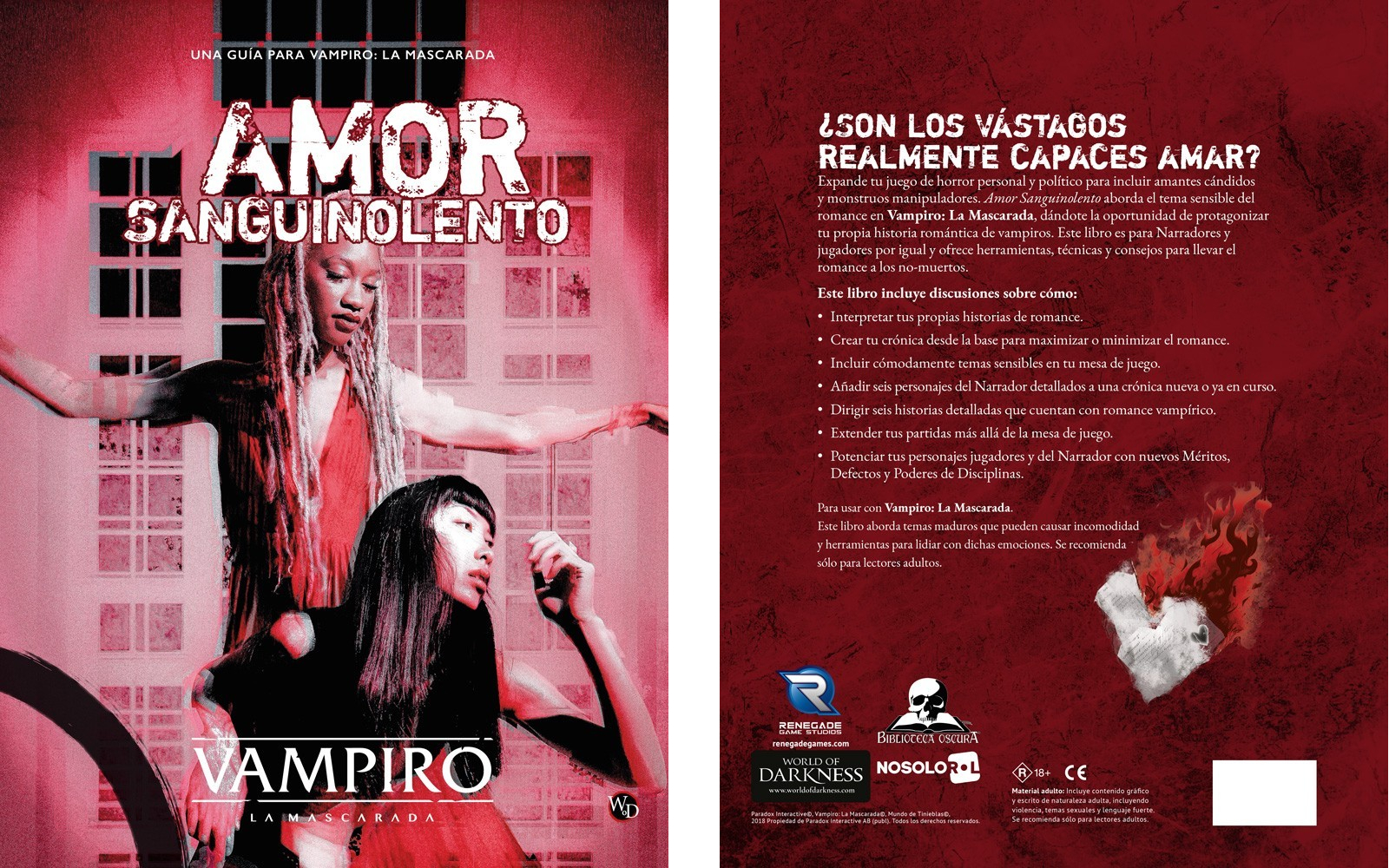 Amor Sanguinolento aborda el tema sensible del romance en Vampiro: La Mascarada, dándote la oportunidad de protagonizar tu propia historia romántica de vampiros. Este libro es para Narradores y jugadores por igual y ofrece herramientas, técnicas y consejos para llevar el romance a los no-muertos.