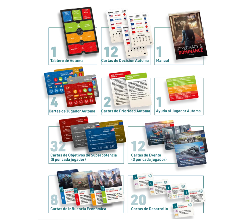 World Order: Diplomacia y Dominio añade una nueva capa estratégica a World Order con nuevos retos y modos de juego que pondrán a prueba tus habilidades. Utiliza nuevas cartas de habilidades, crecimiento y activos estratégicos para extender tu influencia; cumple las cartas de objetivos de superpotencia que reflejan las principales visiones estratégicas de nuestro tiempo; y desafía a uno o varios autómatas para afirmar tu dominio sobre otras superpotencias, sin importar su número.